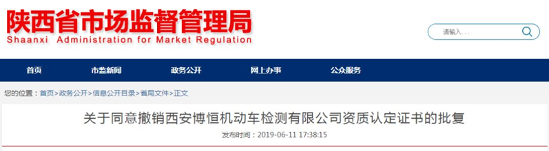 昨天(6月11日),陜西省市場監管局官網發布關于同意撤銷西安博恒機動車檢測有限公司資質認定證書的批復。