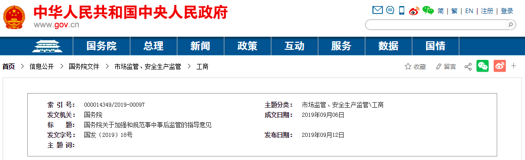各省、自治區、直轄市人民政府,國務院各部委、各直屬機構:為深刻轉變政府職能,深化簡政放權、放管結合、優化服務改革,進一步加強和規范事中事后監管,以公正監管促進公平競爭,加快打造市場化法治化國際化營商環境,提出以下意見。(一)指導思想。以習近平新時代中國特色社會主義思想為指導,全面貫徹黨的十九大和十九屆二中、三中全會精神,牢固樹立新發展理念,充分發揮市場在資源配置中的決定性作用,更好發揮政府作用,持續深化“放管服”改革,堅持放管結合、并重,把更多行政資源從事前審批轉到加強事中事后監管上來,落實監管責任,健全監管規則,創新監管方式,加快構建權責明確、公平公正、公開透明、簡約高效的事中事后監管體系,形成市場自律、政府監管、社會監督互為支撐的協同監管格局,切實管出公平、管出效率、管出活力,促進提高市場主體競爭力和市場效率,推動經濟社會持續健康發展。