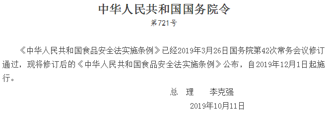 《中華人民共和國食品安全法實施條例》發布,12月1日起施行