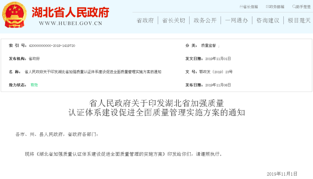 關注 | 湖北省印發加強質量認證體系建設促進全面質量管理實施方案