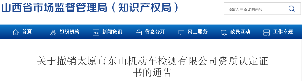 近日,山西省市場監督管理局發布通告,太原市東山機動車檢測有限公司2名工程師資格證書為假證書,該機構資質認定證書被撤銷。